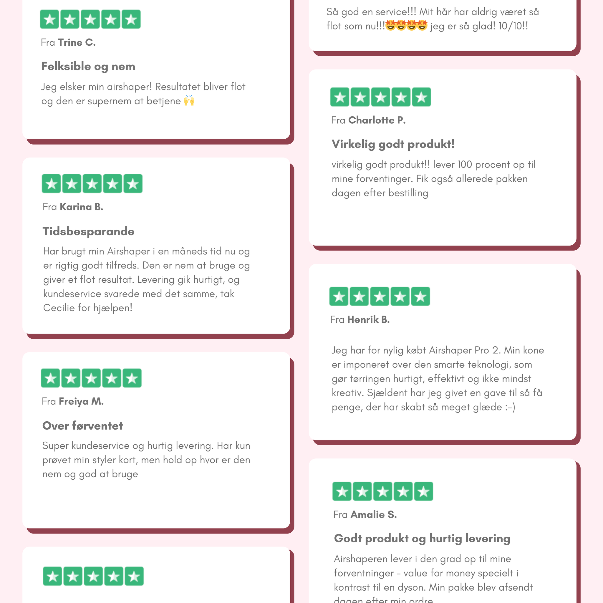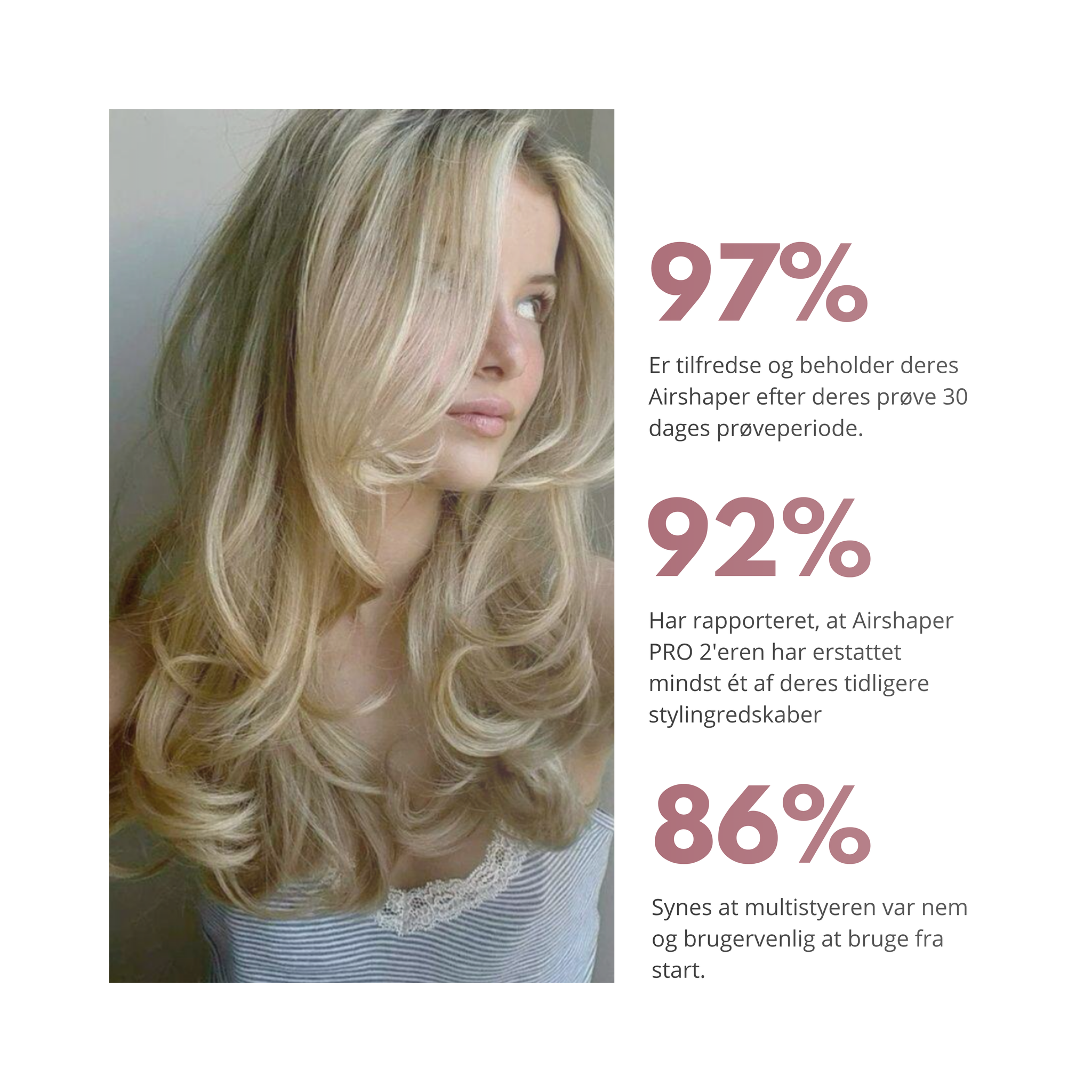 Prøv Airshaper Pro 2 i 30 dage. Hvis du ikke mærker forskellen - mere glans, mere volume, mere wow - så får du alle pengene tilbage. Ingen spørgsmål. Intet bøvl. Læs mere her